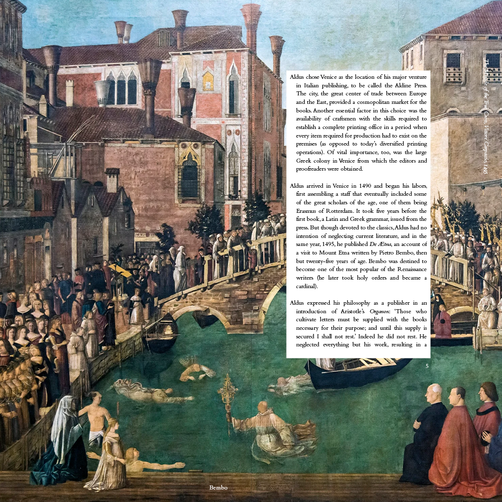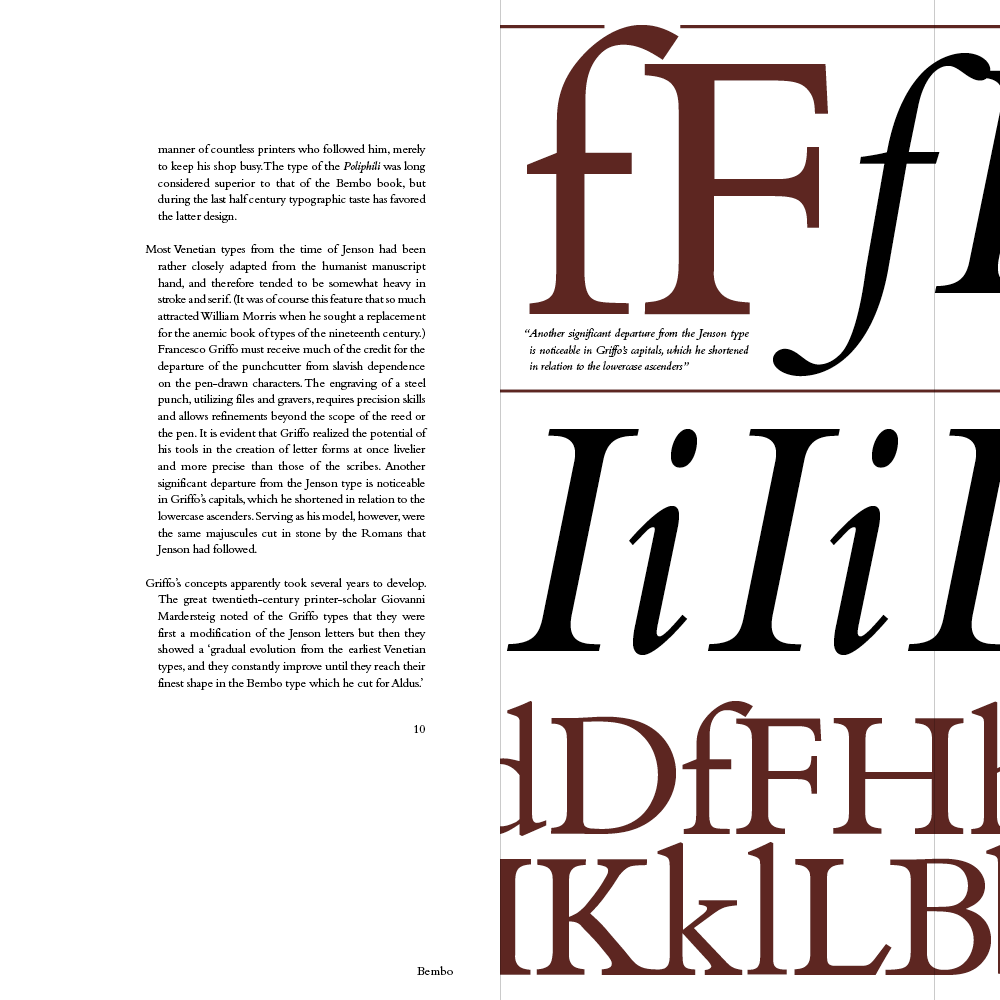 For this work, I studied the history, drawings, and cultural relevance of the classical old-serif typeface, Bembo.