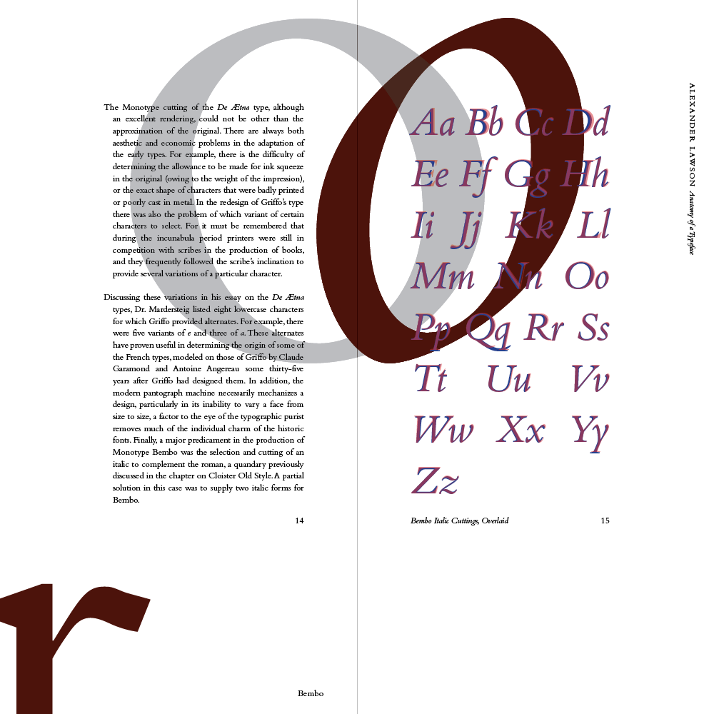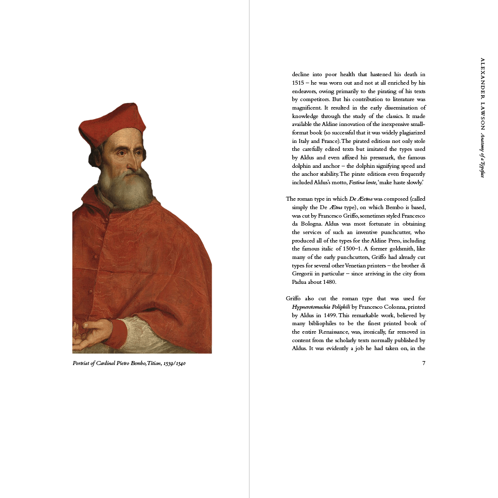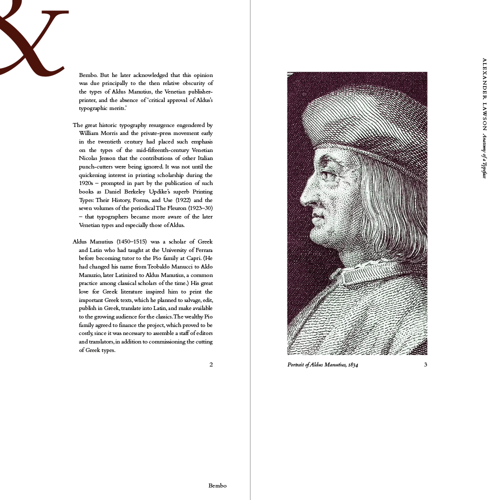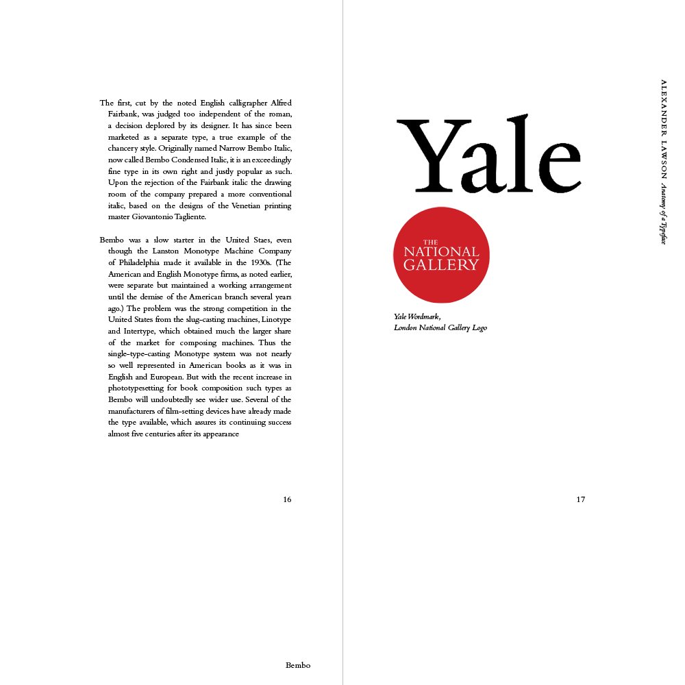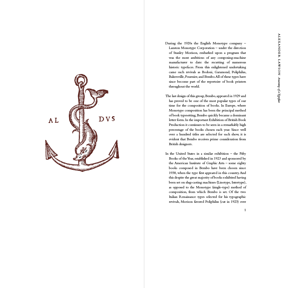 From my research, I designed a physical book detailing its history using excerpts from Lawson’s Anatomy of a Typeface.